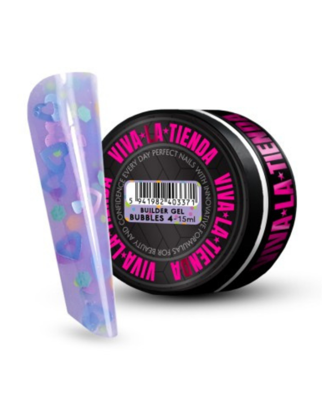 VIVA LA TIENDA BUILDER GEL BUBBLES 04 – LILA este un gel cover autonivelant de construcție. Clientele îl vor îndrăgi pe loc, mai ales dacă apreciază manichiura creativă cu accente glam. Inimioarele și paietele pastelate conferă un aer feminin și fresh, perfect pentru un look de primăvară/vară.