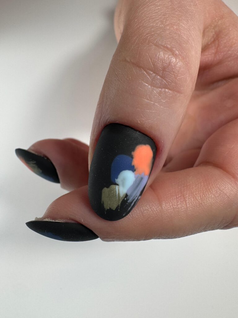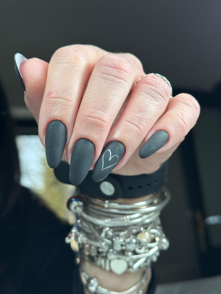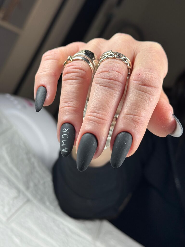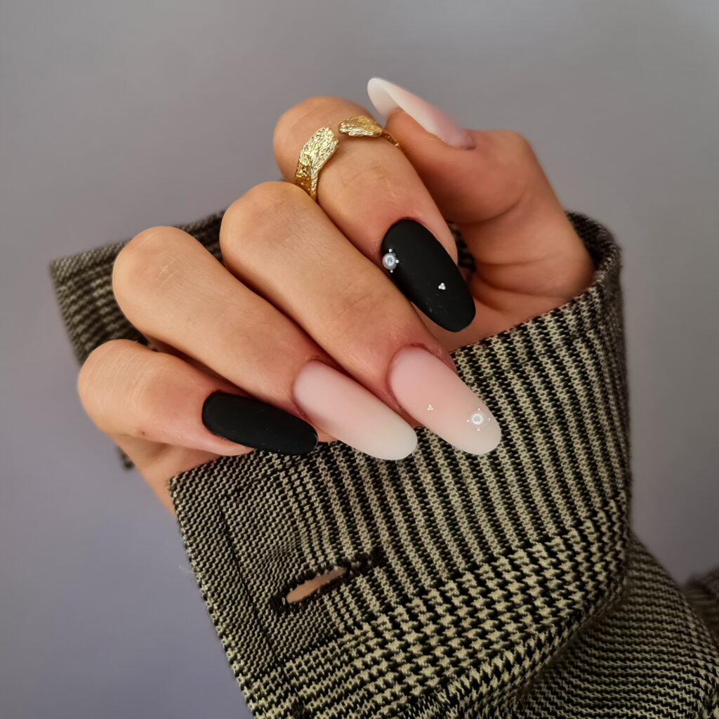 Negrul se vede bine și pe unghiile migdală. Testează modelele minimaliste și descoperă alte modele de unghii migdală în articolul dedicat. Găsești inspirație pentru fiecare lună a anului. Ai multe opțiuni, ai multe idei pe care le poți testa.