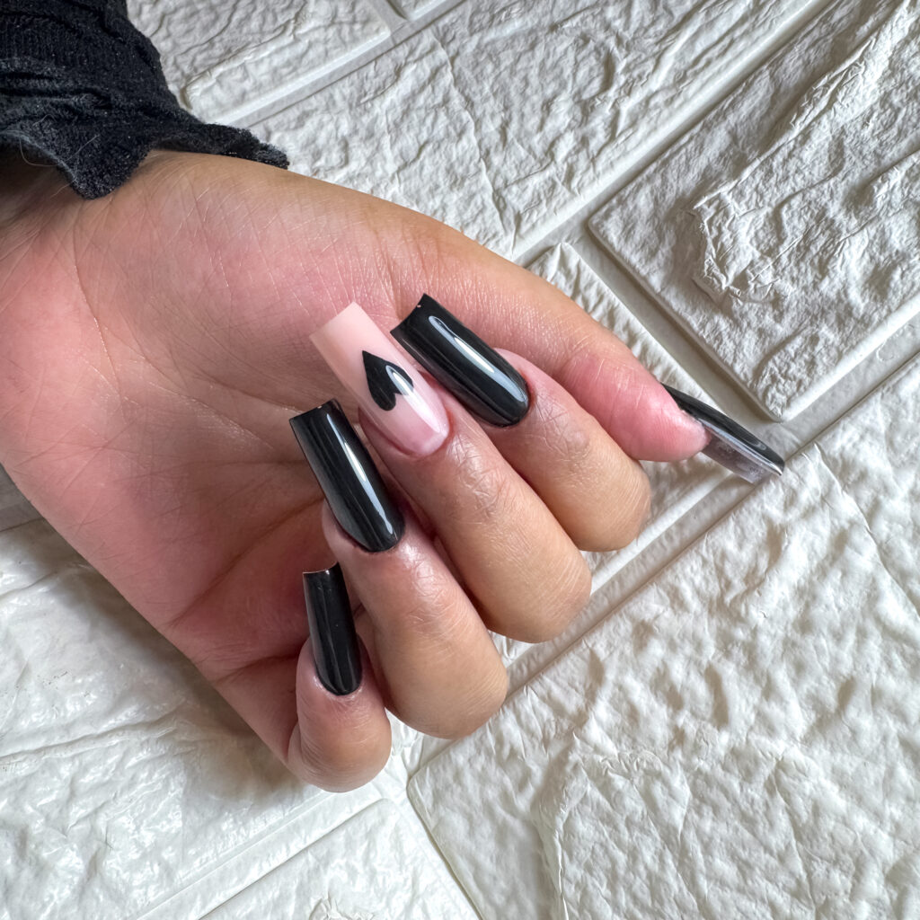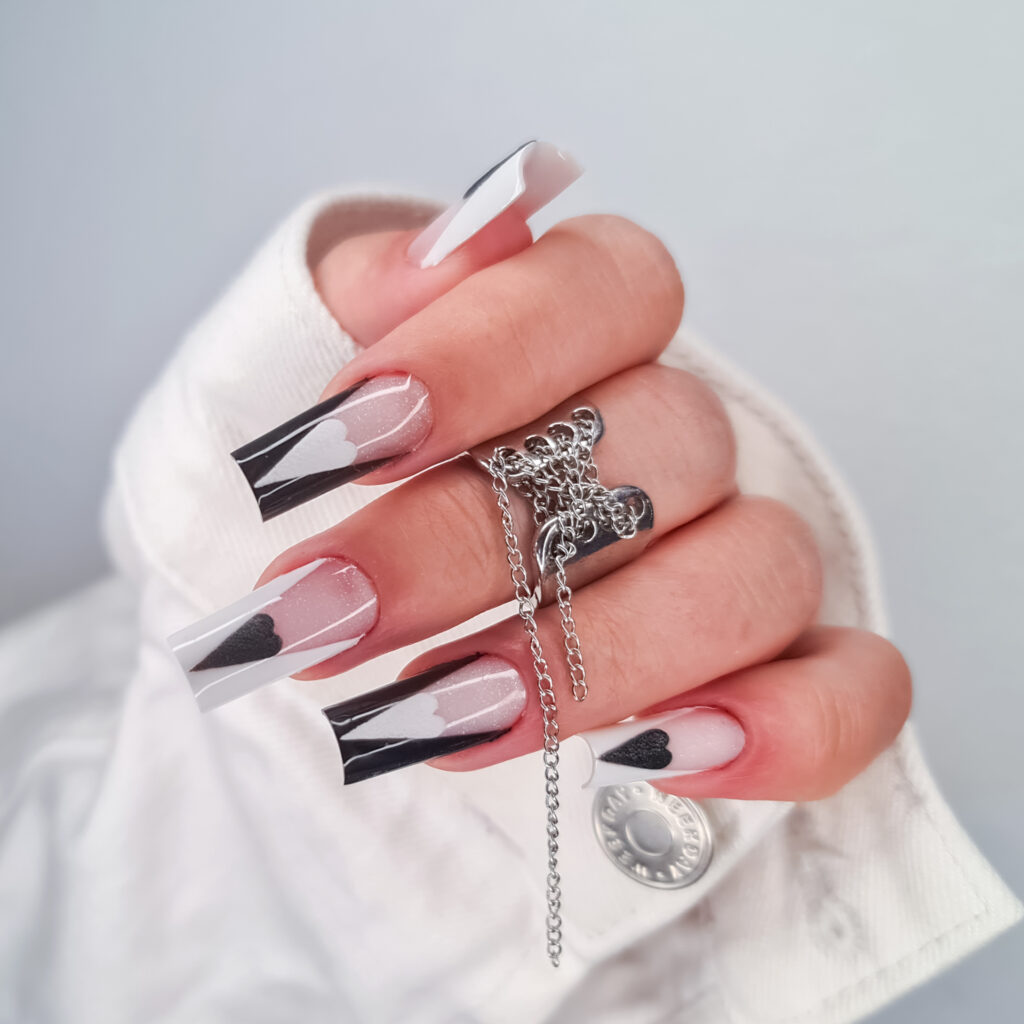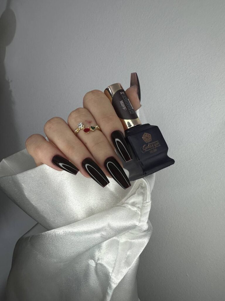 Ai găsit un model de unghii cu gel negre, dar nu știi pe ce formă se va vedea cel mai bine? Ai purtat vreodată unghii balerină? Se mai numesc și cofiin nails. Au vârfurile late și ușor drepte, asemănătoare cu poantele balerinelor. Găsești numeroase combinații care pun negrul în evidență.