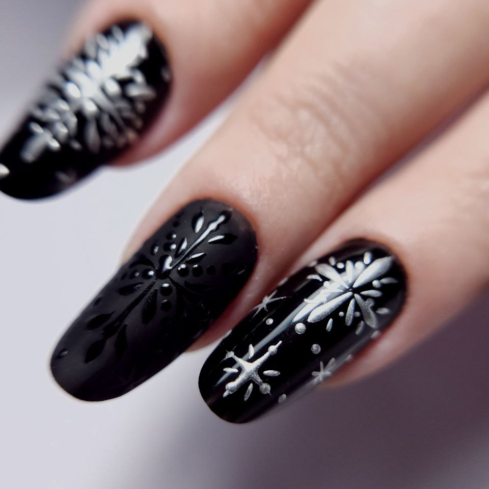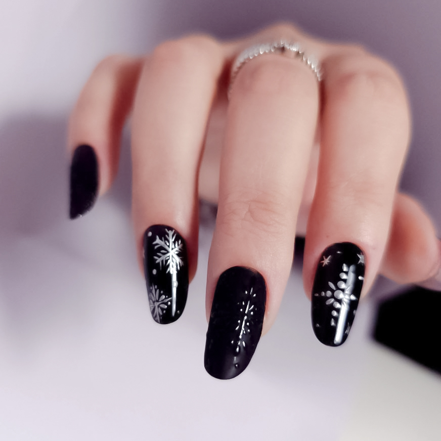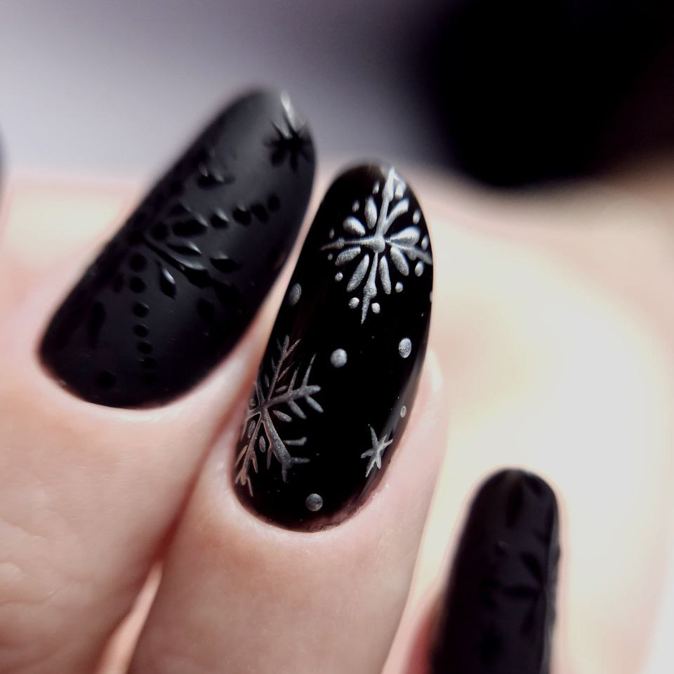 De Crăciun, poți folosi negrul ca bază neutră pe care să adaugi accente festive – decorațiuni, desene, glitter, fulgi și pietricele. Nu uita de steluțe și detalii luminoase! Unghii negre de Crăciun? Genial! Acum ai unghii de Crăciun negre.