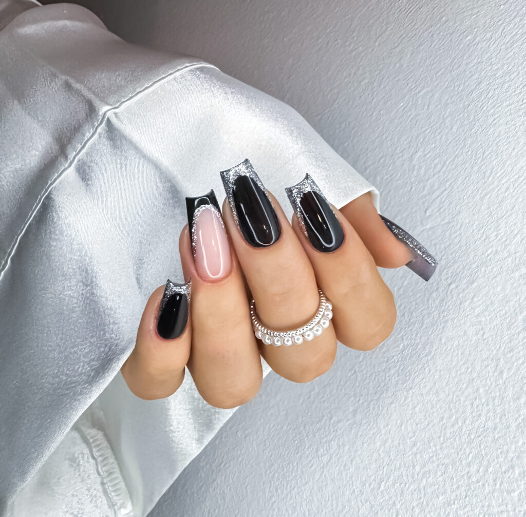 Sparkle! Sparkle! Sparkle! Căutai inspirație? Căutai modele de unghii negre cu sclipici? Sunt cele mai spectaculoase și versatile variante. Așa poți adăuga un vibe glam ținutelor tale. Cele mai populare modele sunt cele cu accent nail (sclipici pe o singură unghie), gradient, full glitter și mix and match. Poți crea și modele de unghii french negre cu puțin sclipici la vârfuri.
