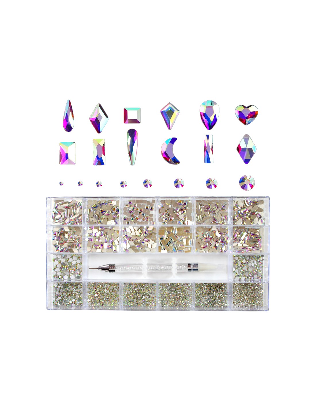 Casetă ce conține un mix de cristale cu dimensiuni și forme diferite. Aplicatorul are 2 capete, unul metalic și unul de ceară. Cutia conține 20 de tipuri de cristale cu reflexii multicolore, a câte 50 de bucăți din fiecare tip.