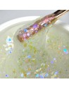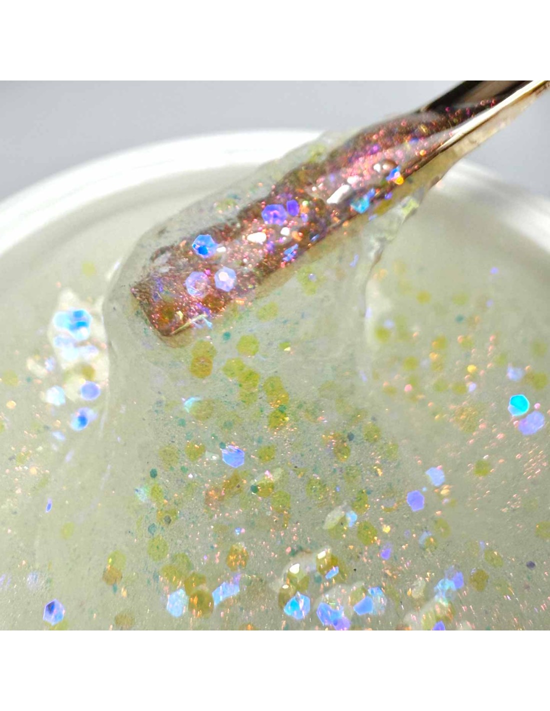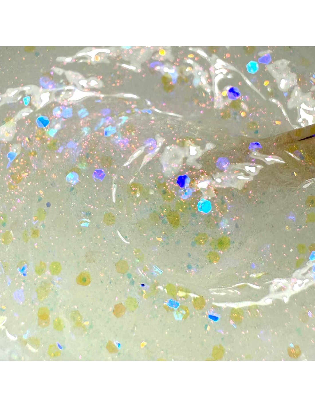 🤍 nuanță alb sidefată ✨ îmbogățită cu sclipici fin și paiete cu irizații cu note aurii, turcoaz și violet