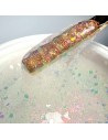 🤍 nuanță alb sidefată ✨ îmbogățită cu sclipici fin și paiete cu irizații cu note aurii, turcoaz și portocaliu