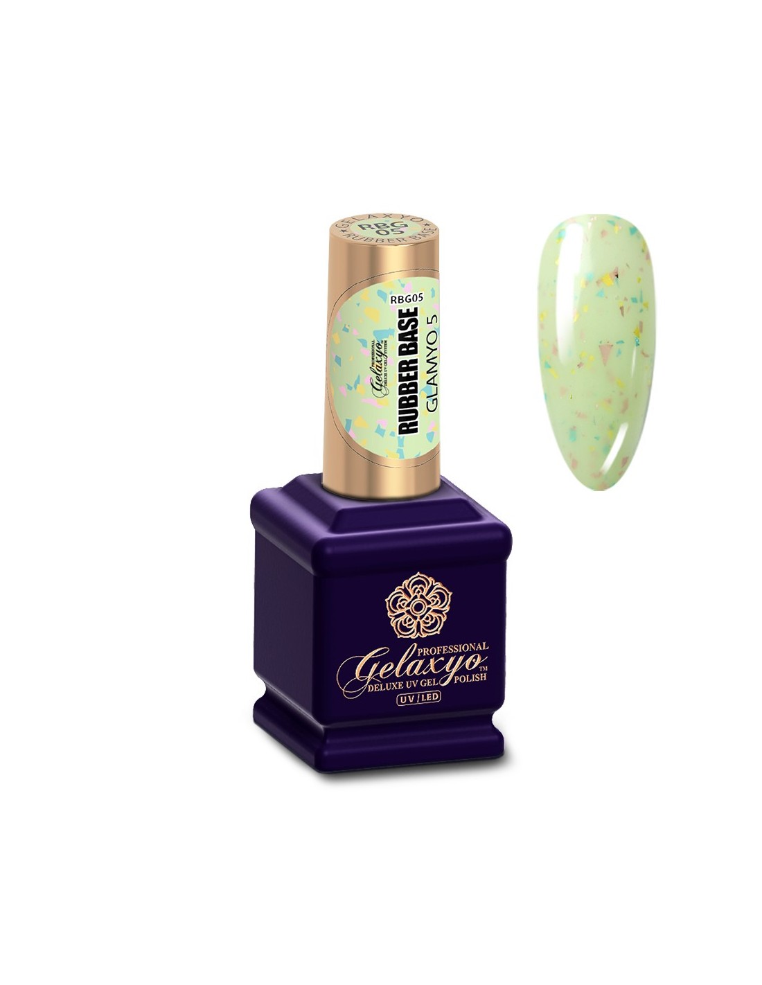 Gelaxyo Rubber Base Glamyo 5 este o bază de culoare verde cu fulgi aurii, turcoaz și roz pentru un aspect suav și delicat. Formula sa inovatoare nu necesită aplicarea unei alte baze în prealabil, precum și modelarea cu ușurință a apexului, simplificând modul de aplicare.