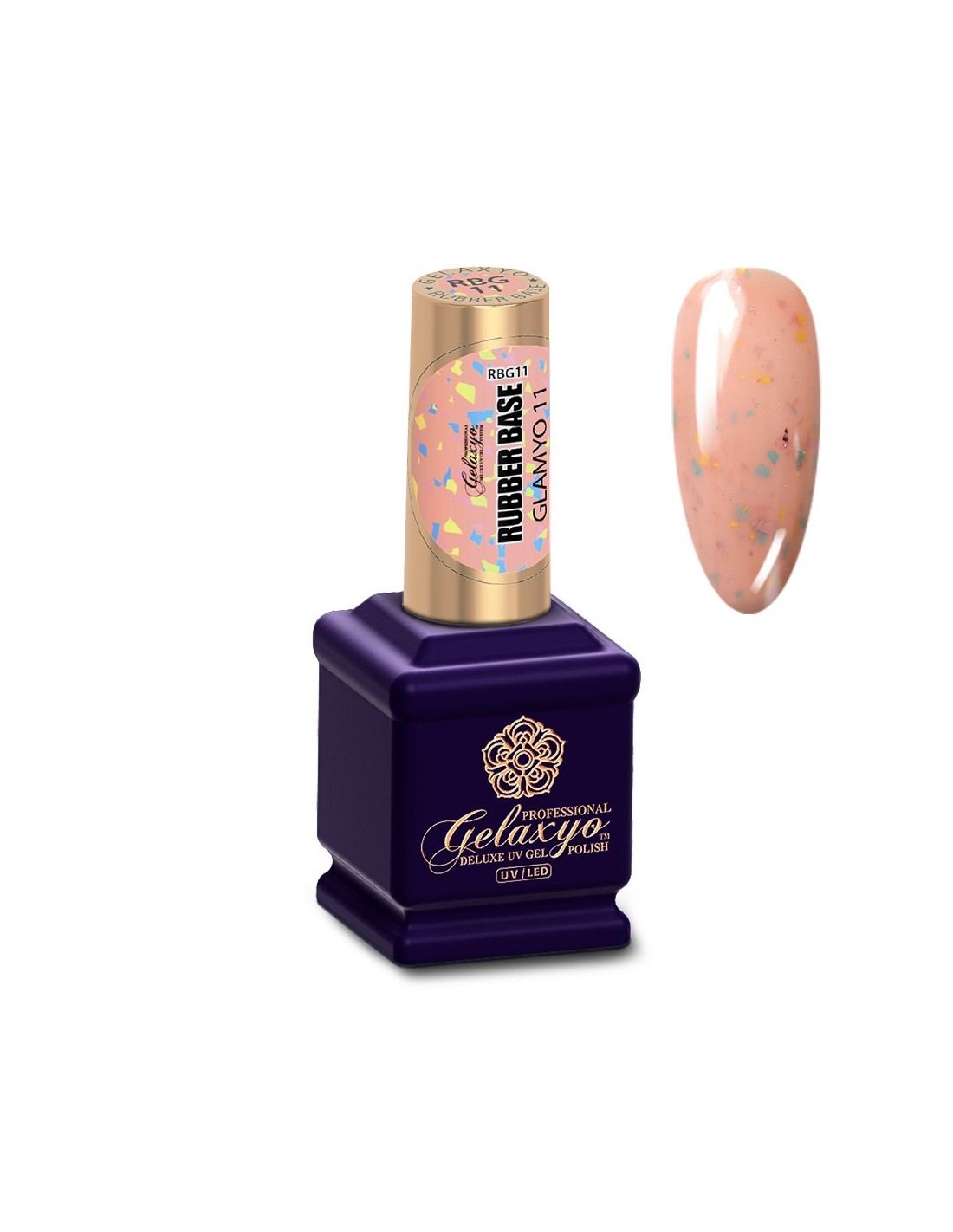 Gelaxyo Rubber Base Glamyo11 este o bază de culoare roz cu fulgi aurii, turcoaz și roz pentru un aspect suav și delicat. Formula sa inovatoare nu necesită aplicarea unei alte baze în prealabil, precum și modelarea cu ușurință a apexului, simplificând modul de aplicare.
