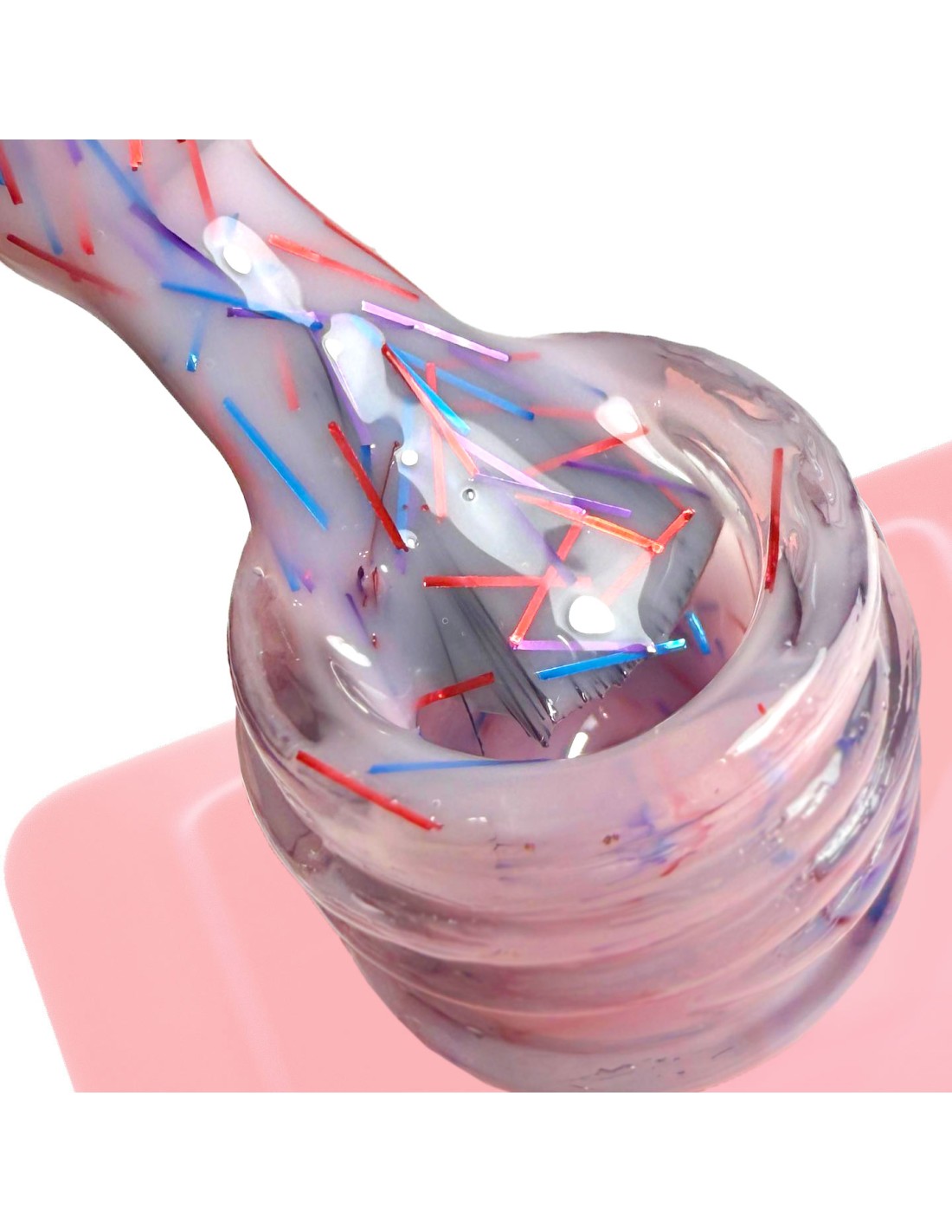 Transformă orice manichiură într-o adevărată sărbătoare cu Gelaxyo Rubber Base Party 🎉 — baza cu confeti multicolore care aduce instant bucurie și stil unghiilor tale! Formula sa autonivelantă, cu vâscozitate medie, permite modelarea precisă a apexului fără a curge spre cuticule, oferind un control perfect la aplicare!