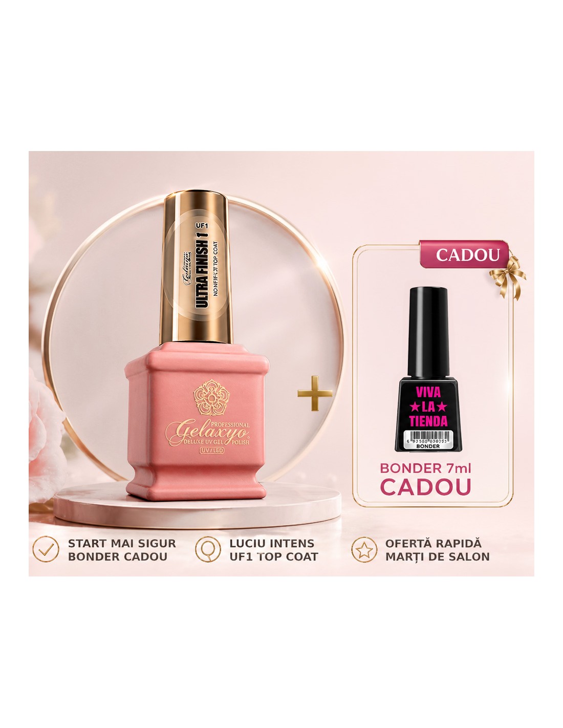 UF1 mare + Bonder cadou este oferta de salon pentru un început mai sigur și un final lucios. Primești Gelaxyo Ultra Finish UF1 15ml la preț special, împreună cu Bonder 7ml cadou, util pentru pregătirea corectă a unghiei naturale.