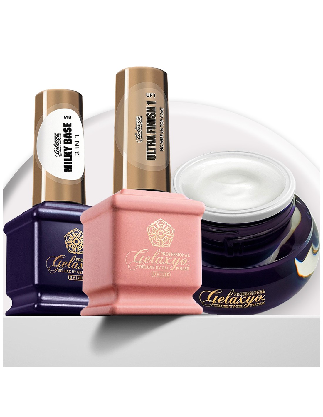 Pachetul GELAXYO MILKY SET reunește 3 produse esențiale pentru realizarea unui serviciu complet de salon: bază, structură și finish.