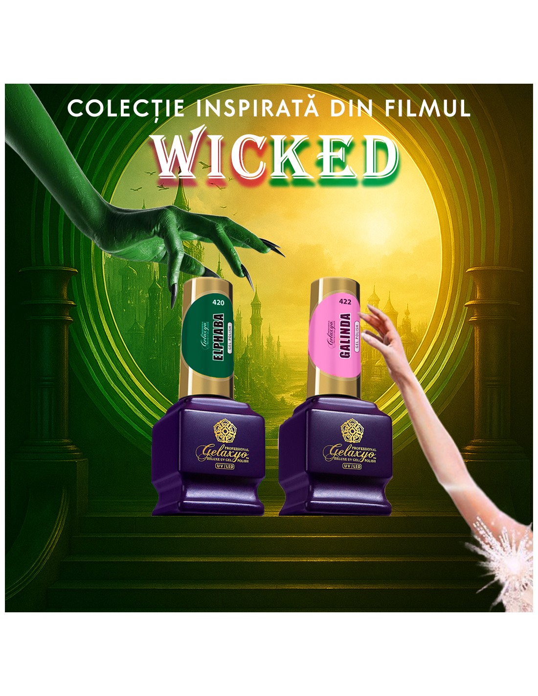 Pachet alcătuit din 2 Oje Semipermanente Gelaxyo 7ml - ce conține oja 420 Elphaba și 422 Galinda, două nuanțe inspirate din filmul Wicked.