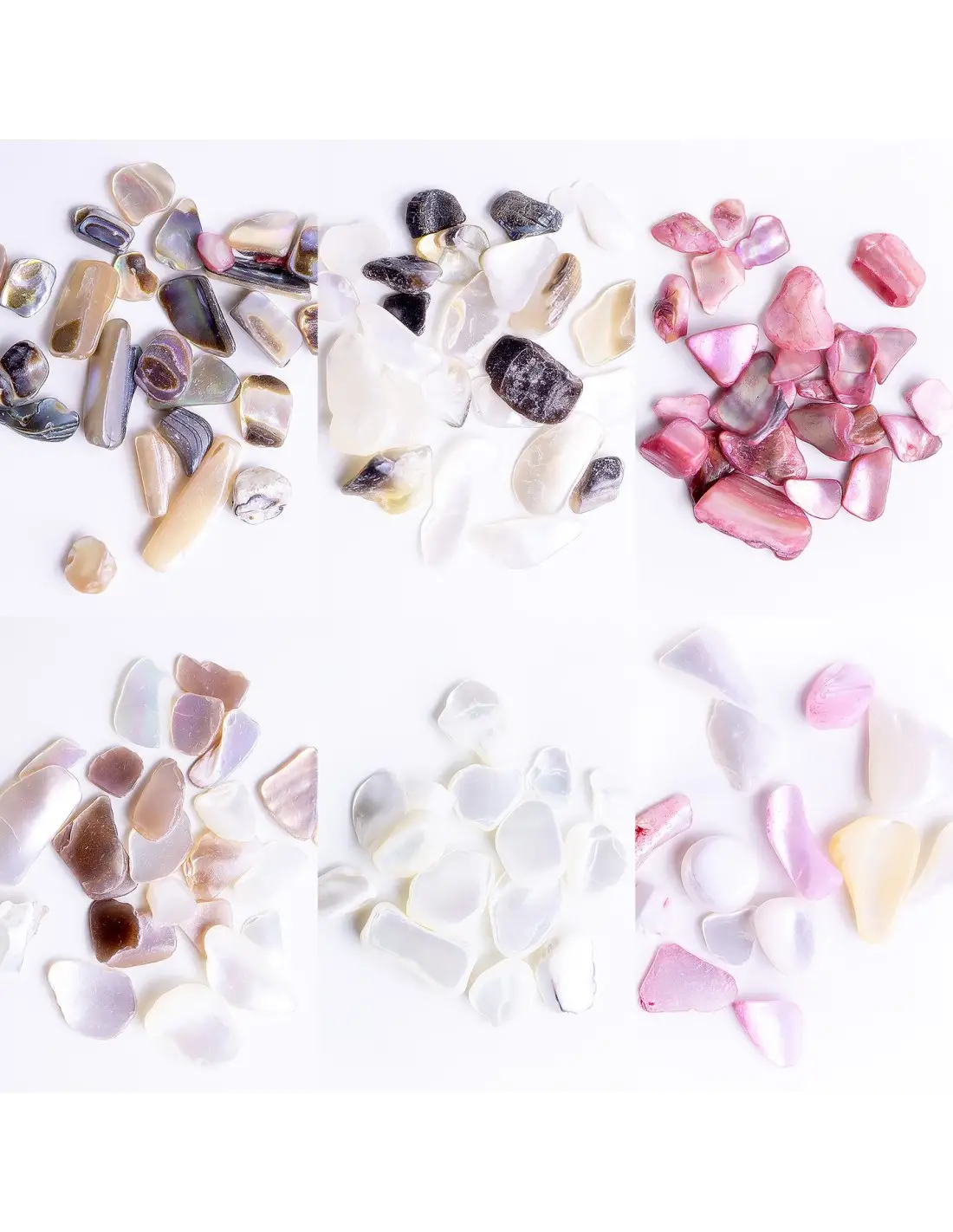 Disc ce contie 6 culori de fragmente concasate din scoici naturale, impregnate cu pigmenţi speciali pentru culori şi sclipiri superbe! Reprezintă decorul perfect pentru unghiile artificiale. Modelul se sigilează întotdeauna cu un strat de gel transparent.