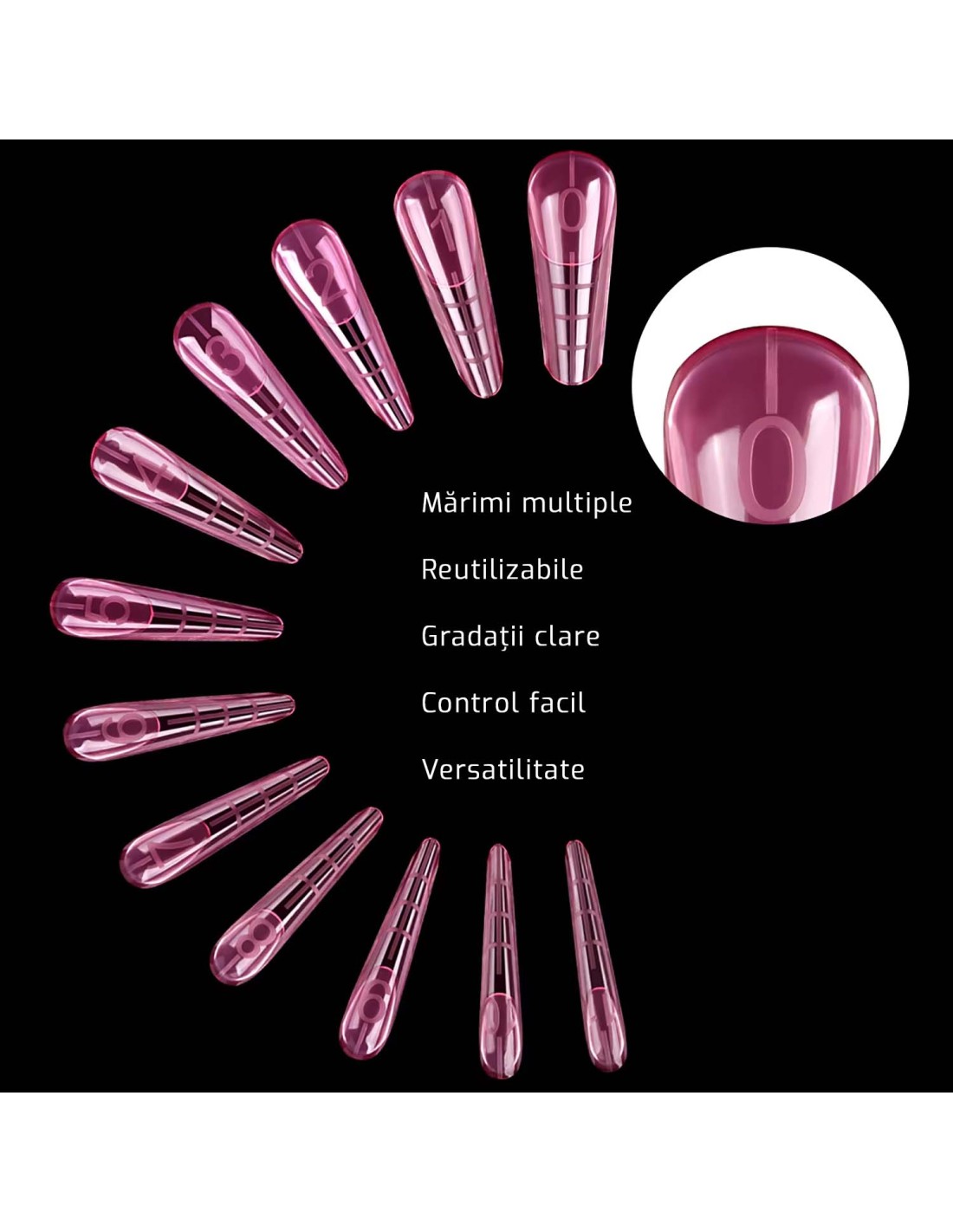 În set gasiti 15 mărimi diferite pentru a potrivi tipsul cu dimensiunea unghiilor natural, iar fiecare mărime sunt cate 8 perechi.