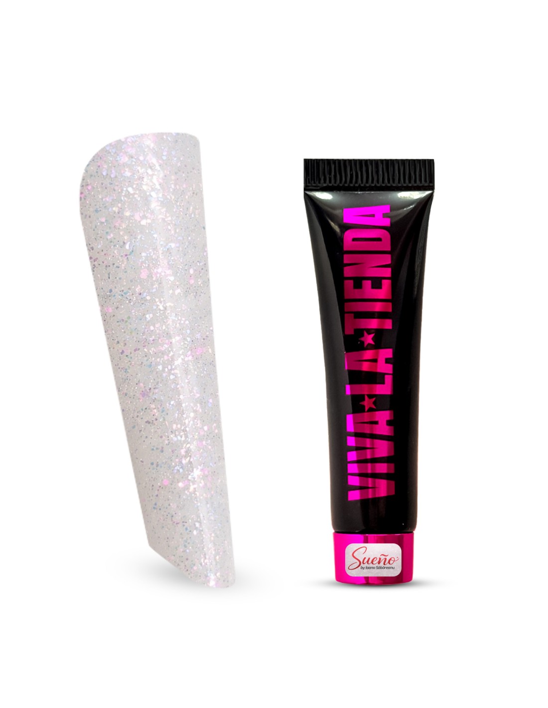 Polygelul Sueño 01– Ivory Glow o nuanță de alb, cu o strălucire roz cu reflexii multicolore, perfectă pentru manichiuri mereu în tendințe!✨🍦
